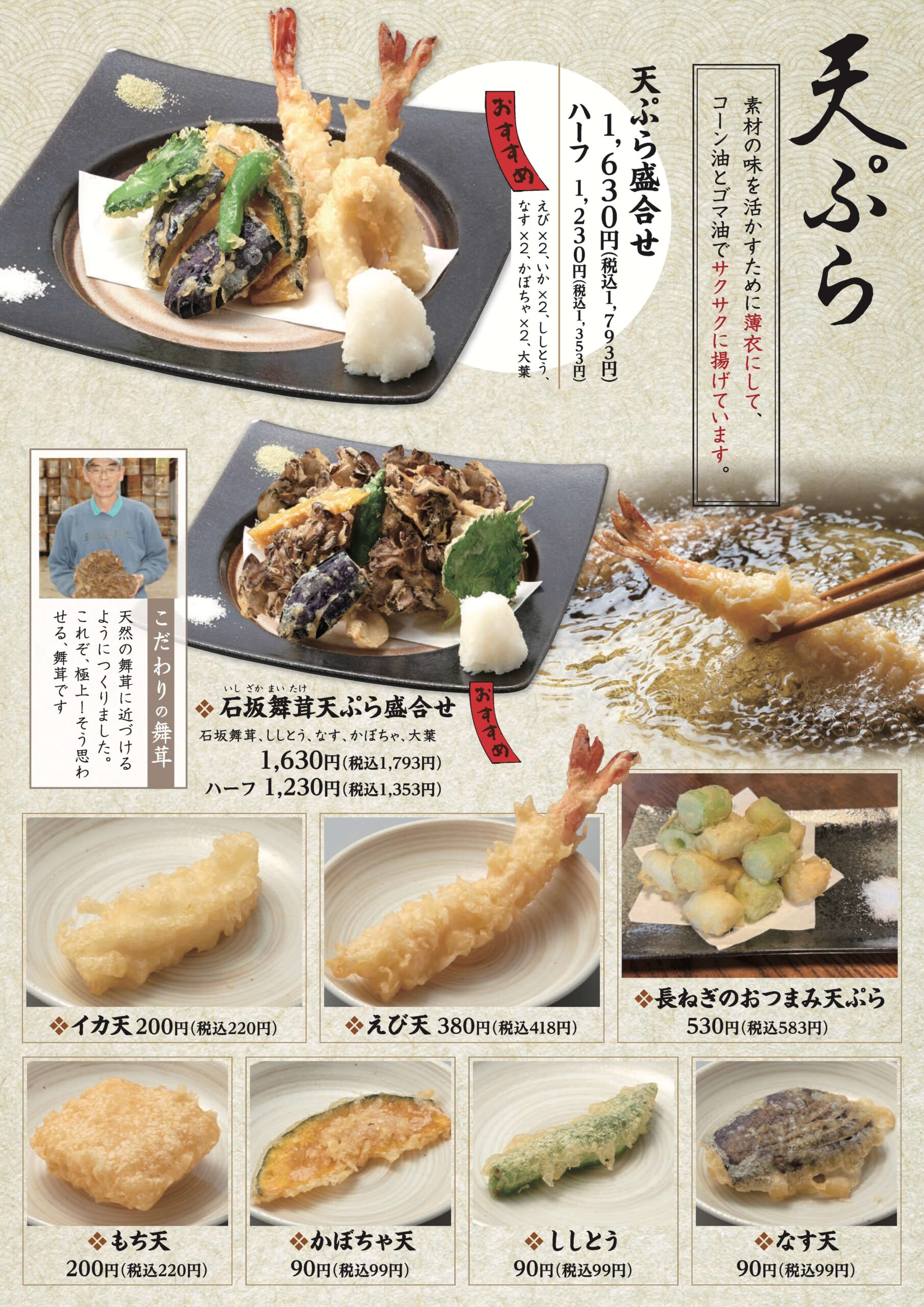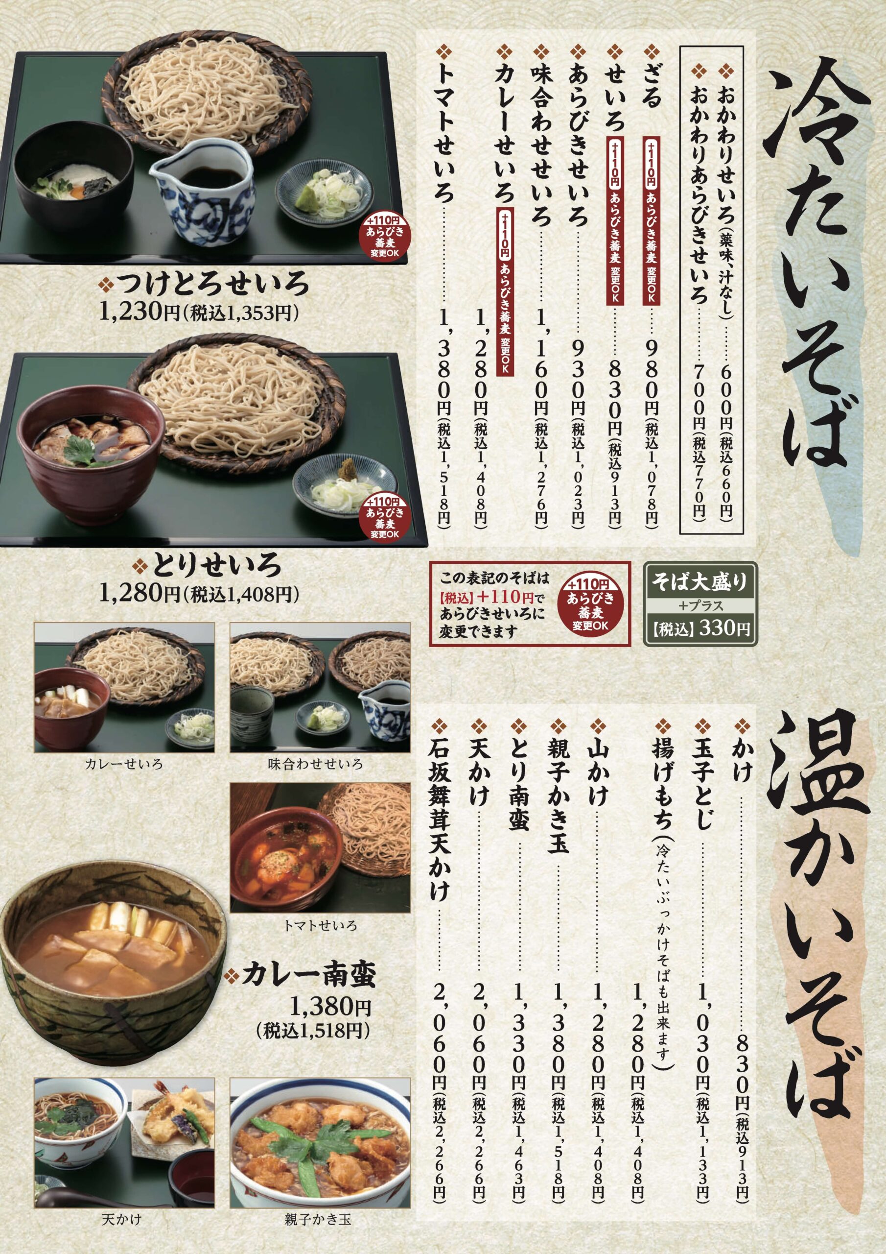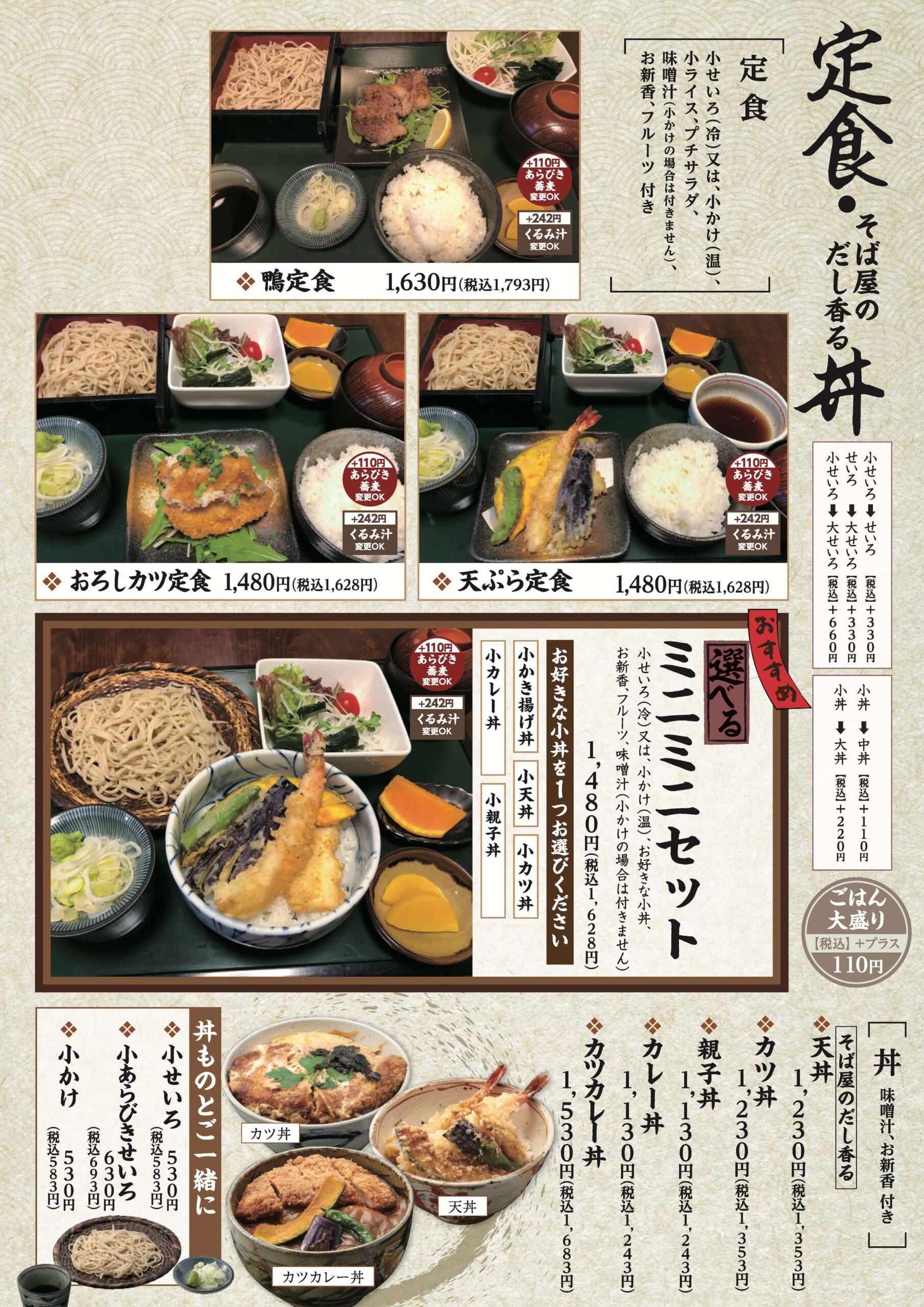 人気メニュー おろしカツ 酒の肴三点盛り 名物くるみそば 天せいろ 石坂舞茸天ぷら盛合せ 鴨南蛮 石坂舞茸天せいろ そば焼きみそ 自家製玉子焼き カツ丼 揚げ出しそばがき そばがき団子 ランチメニュー グランドメニュー ドリンクメニュー